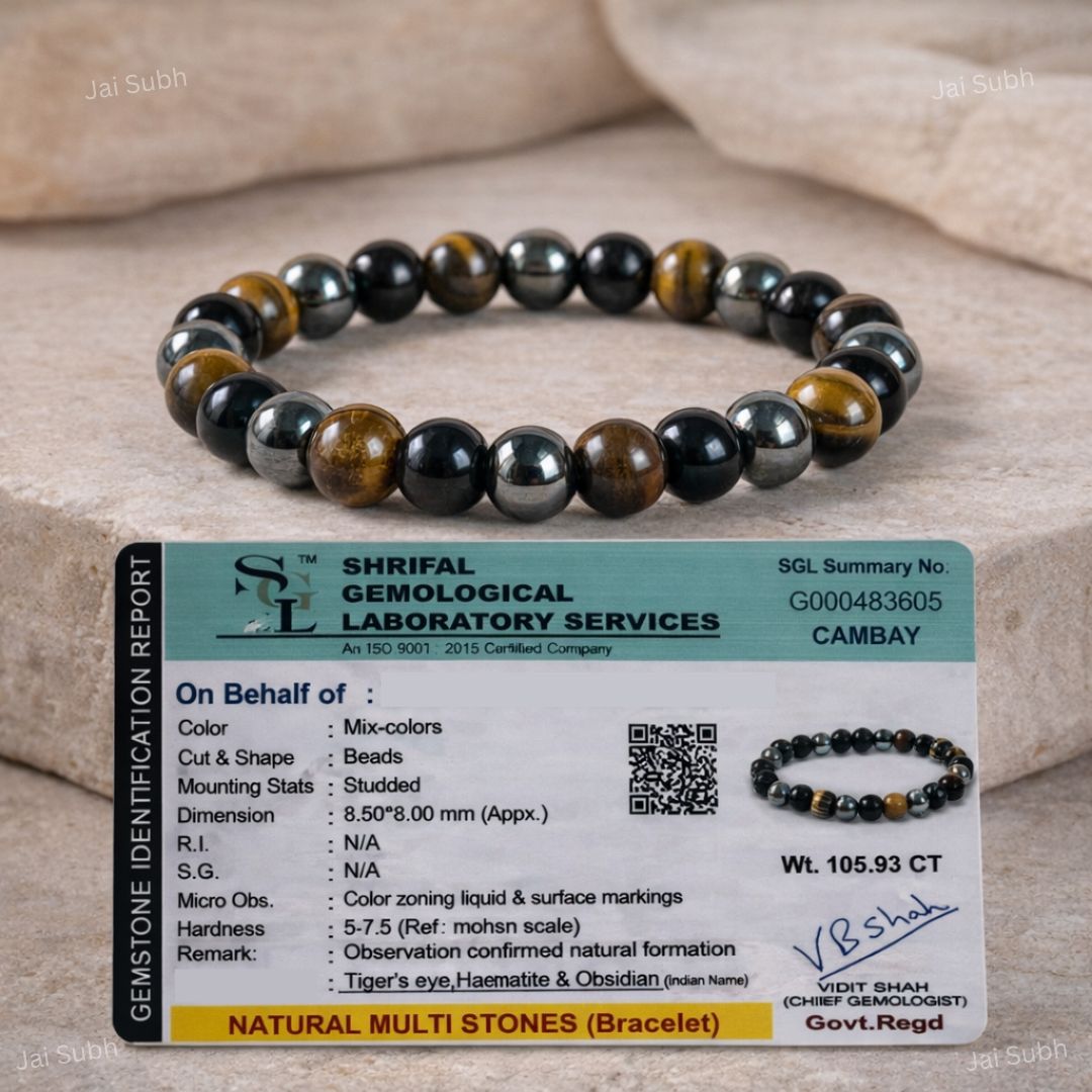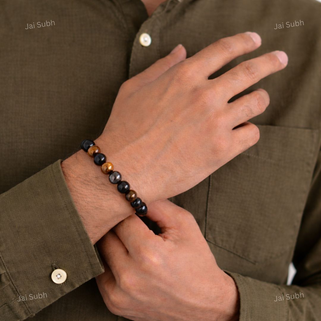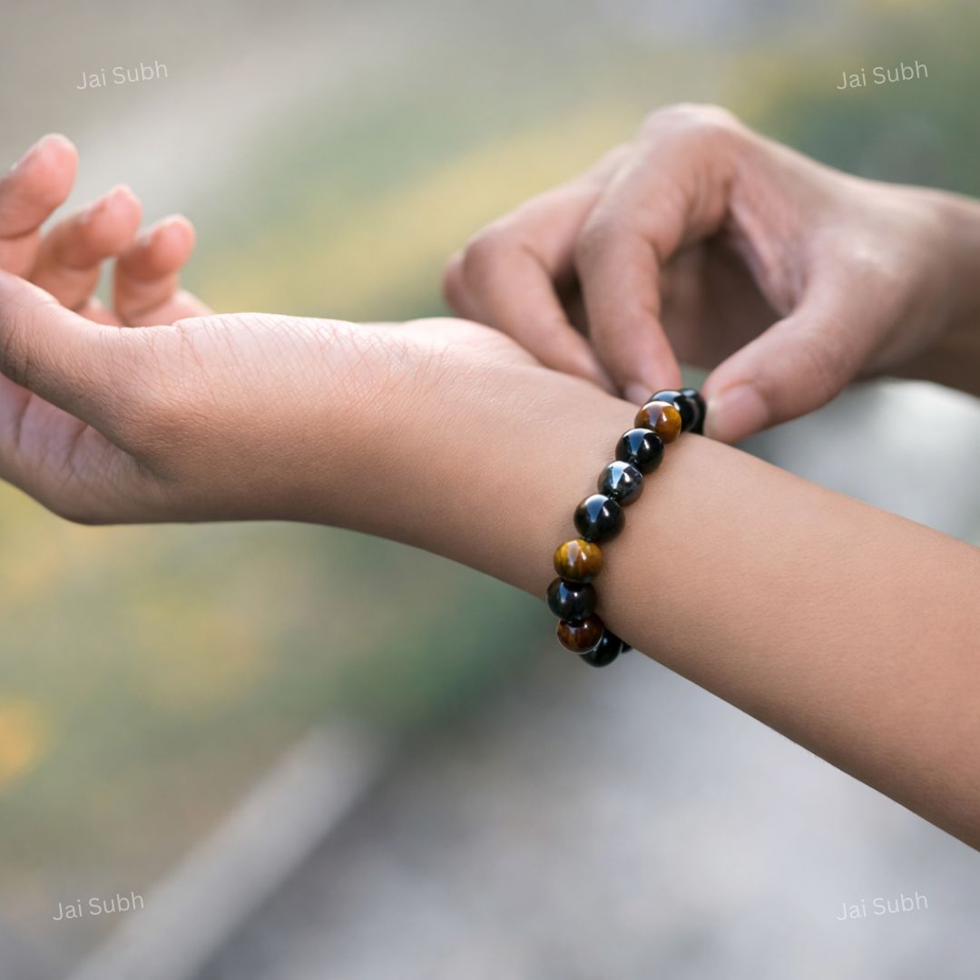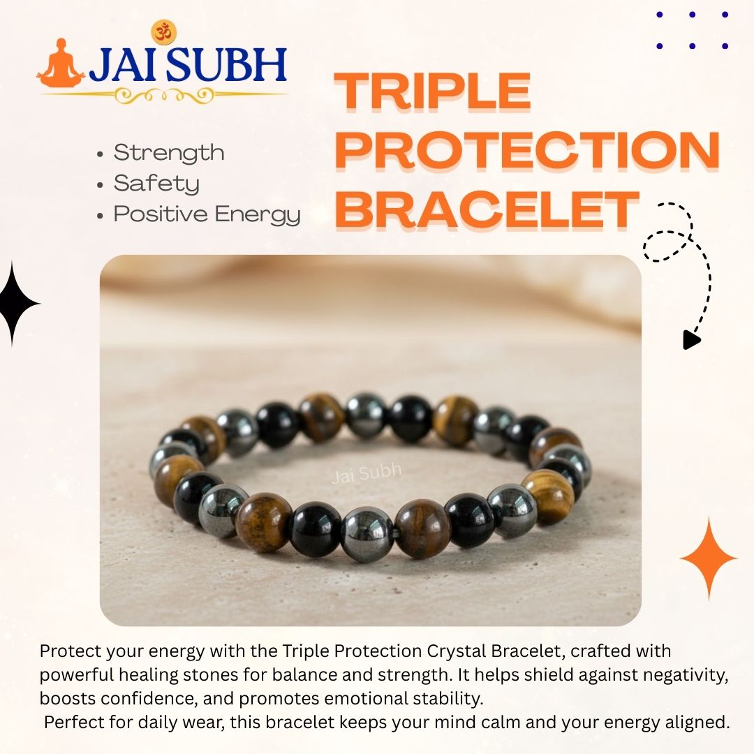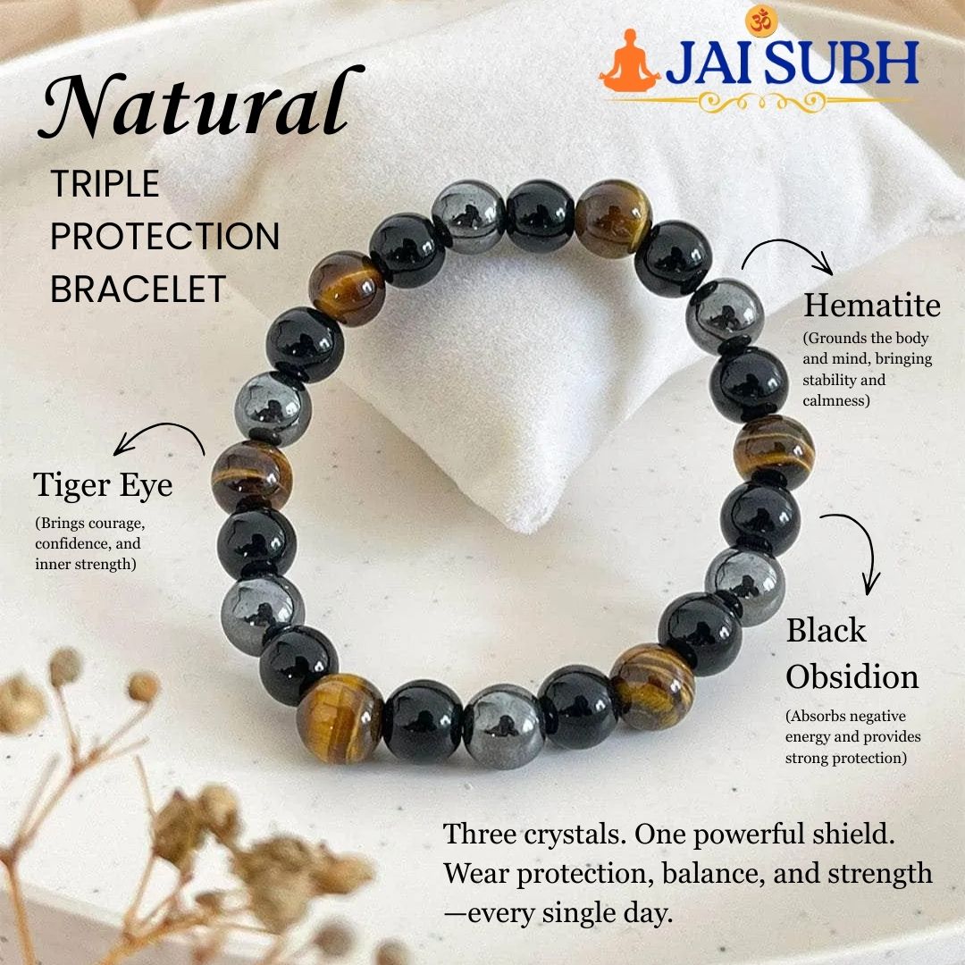 The Triple Protection Crystal Bracelet from Jai Subh is a powerful bracelet made using three protective gemstones: Tiger Eye, Black Obsidian, and Hematite. Together, these stones create a strong energy shield that helps protect you from negativity, fear, and stress. This bracelet is specially designed for people who want strength, confidence, and emotional balance in daily life.